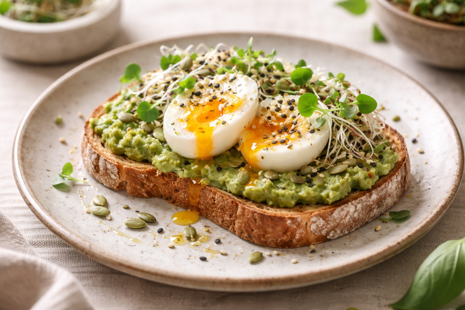 Křupavý kváskový toast s krémovým avokádem, dokonale tekutým vejcem a svěžími klíčky je jednoduchá, ale výživově bohatá snídaně, která dodá energii na celé dopoledne. Kombinace kvalitních tuků, bílkovin a čerstvých mikroživin podporuje vitalitu, zatímco teplý chléb a jemné dochucení vytvářejí harmonický začátek dne inspirovaný principy rovnováhy a vědomého stravování.