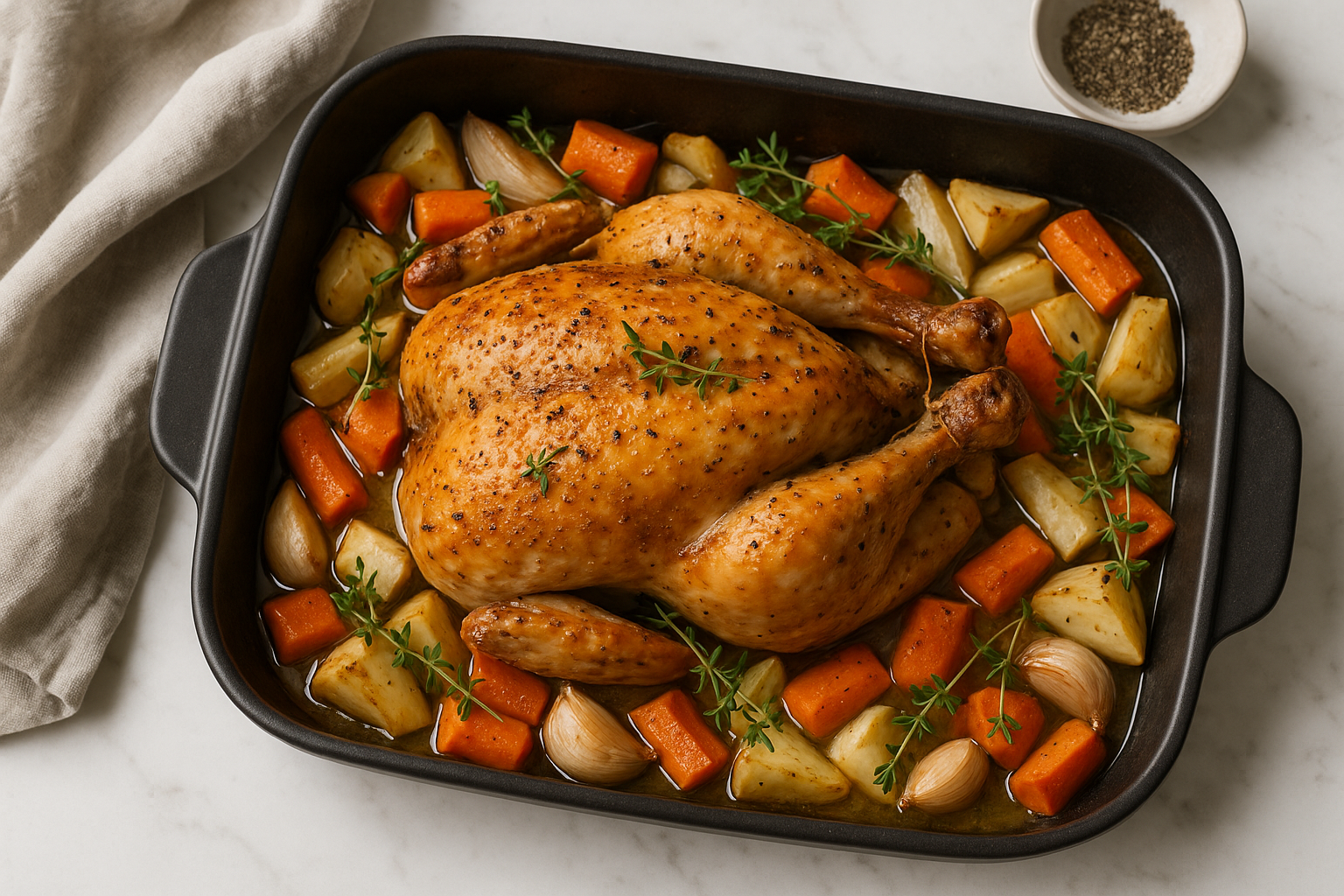 Šťavnaté kuře, voňavá kořenová zelenina a svěží tymián – klasika, která nikdy nezklame. Tento jednoduchý recept zvládne každý a výsledek je vždy efektní: křupavá kůrčička, jemné maso a zelenina nasáklá výpekem. Skvělá volba na rodinný oběd i slavnostní večeři.